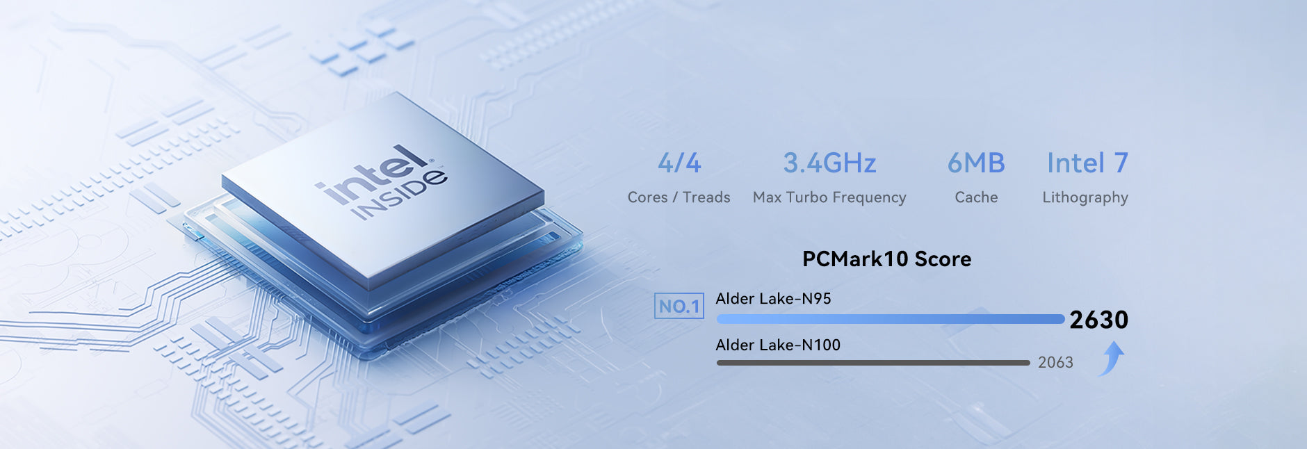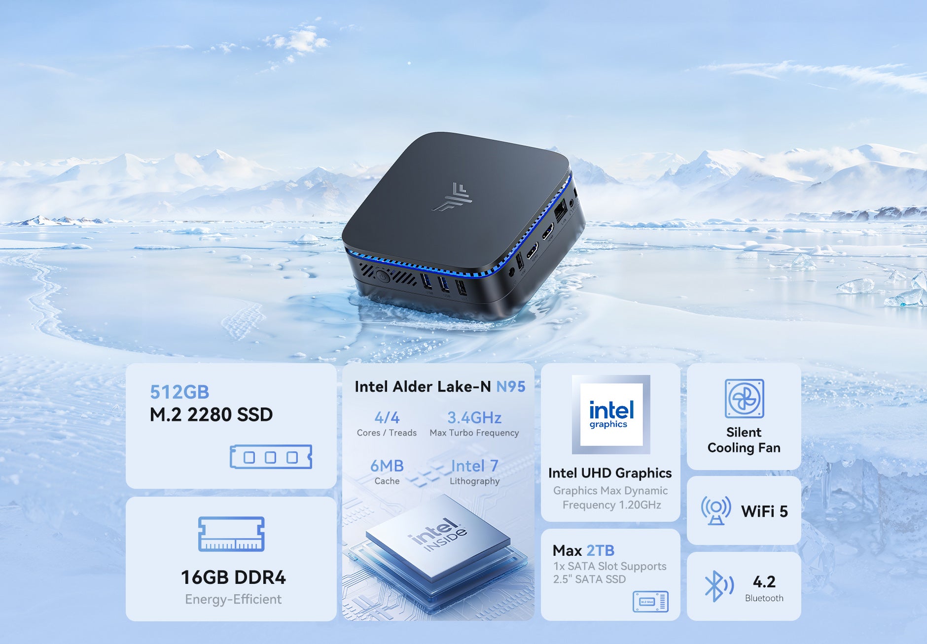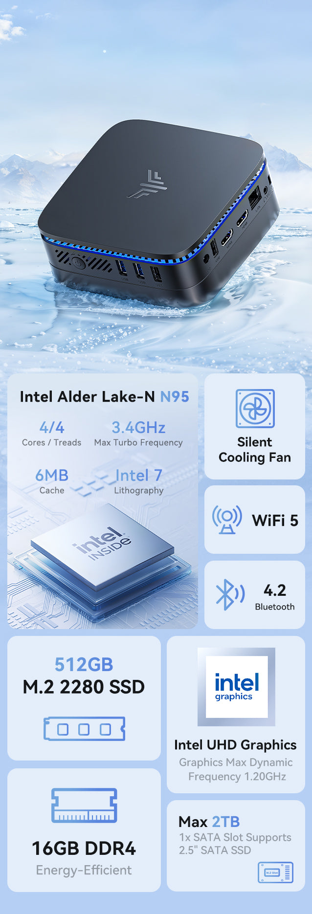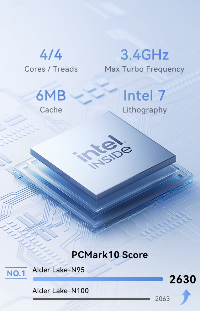 | Processor | Intel® Processor Alder Lake-N N95, 4 Cores/4 Threads(6MB Smart Cache, base frequency 1.7GHz, maximum acceleration clock frequency (Turbo) 3.4GHz) |