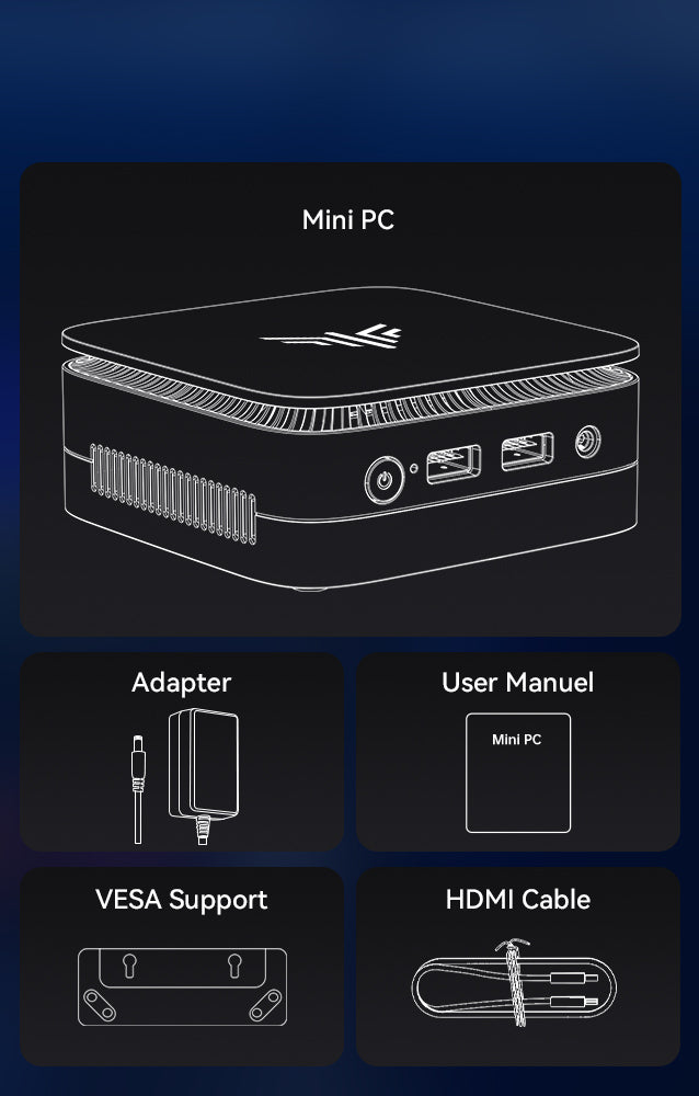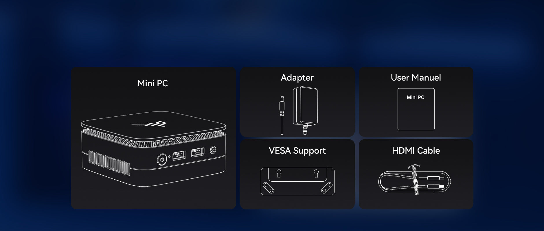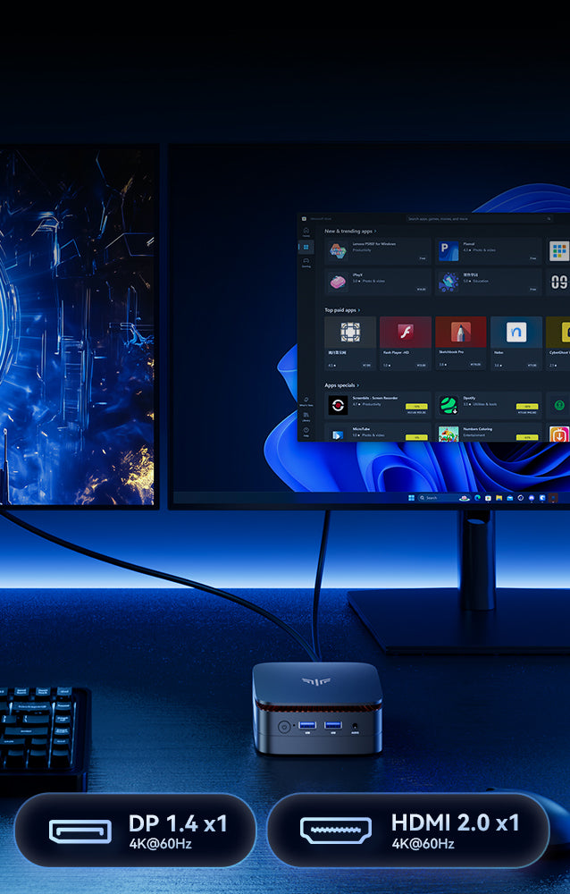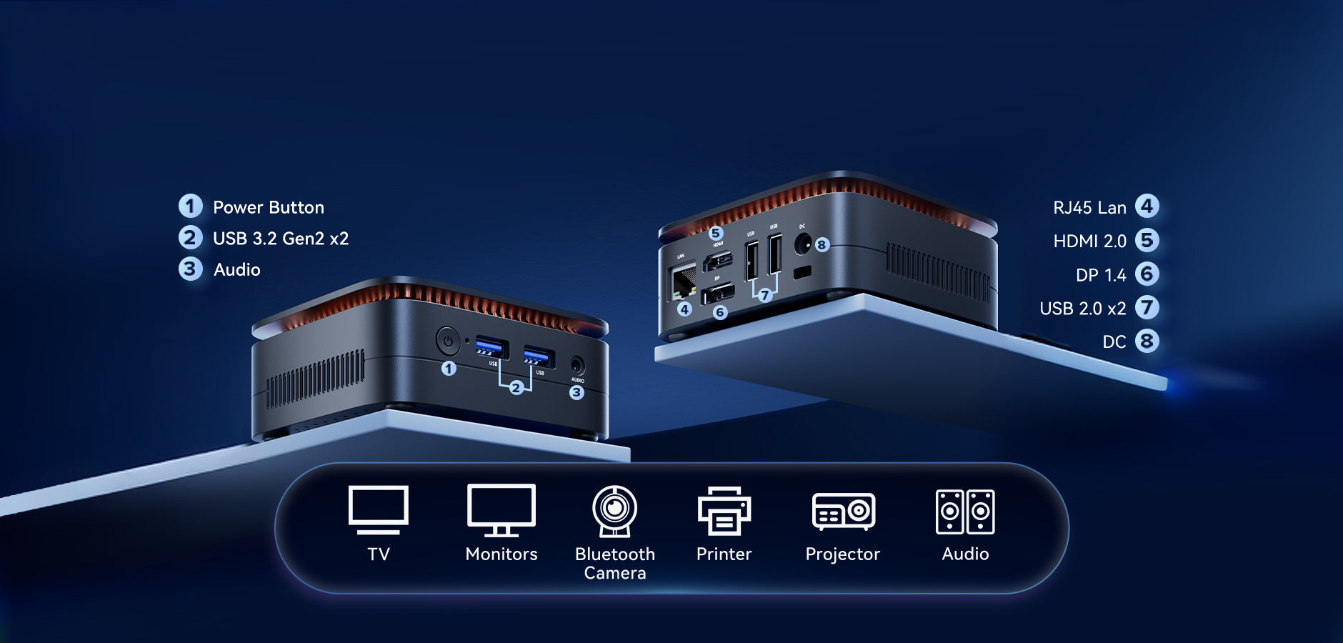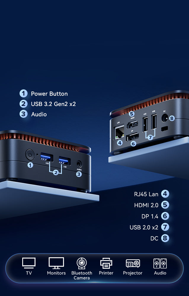 Ports & Buttons | 10M/100M/1000Mbps adaptive RJ45 Gigabit Ethernet Port *1 USB3.2 Gen2 Type-A Port *2 USB2.0 Type-A Port * 2 DC IN *1 HDMI 2.0 *1 DP1.4 *1 3.5mm Audio Jack *1 Power Button *1 |