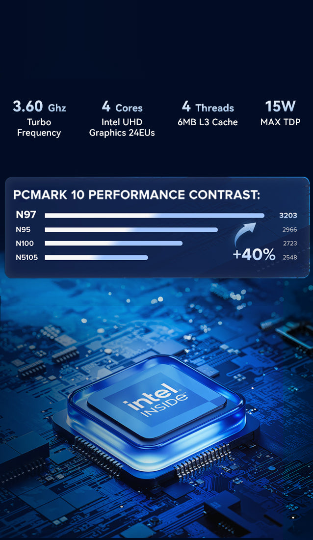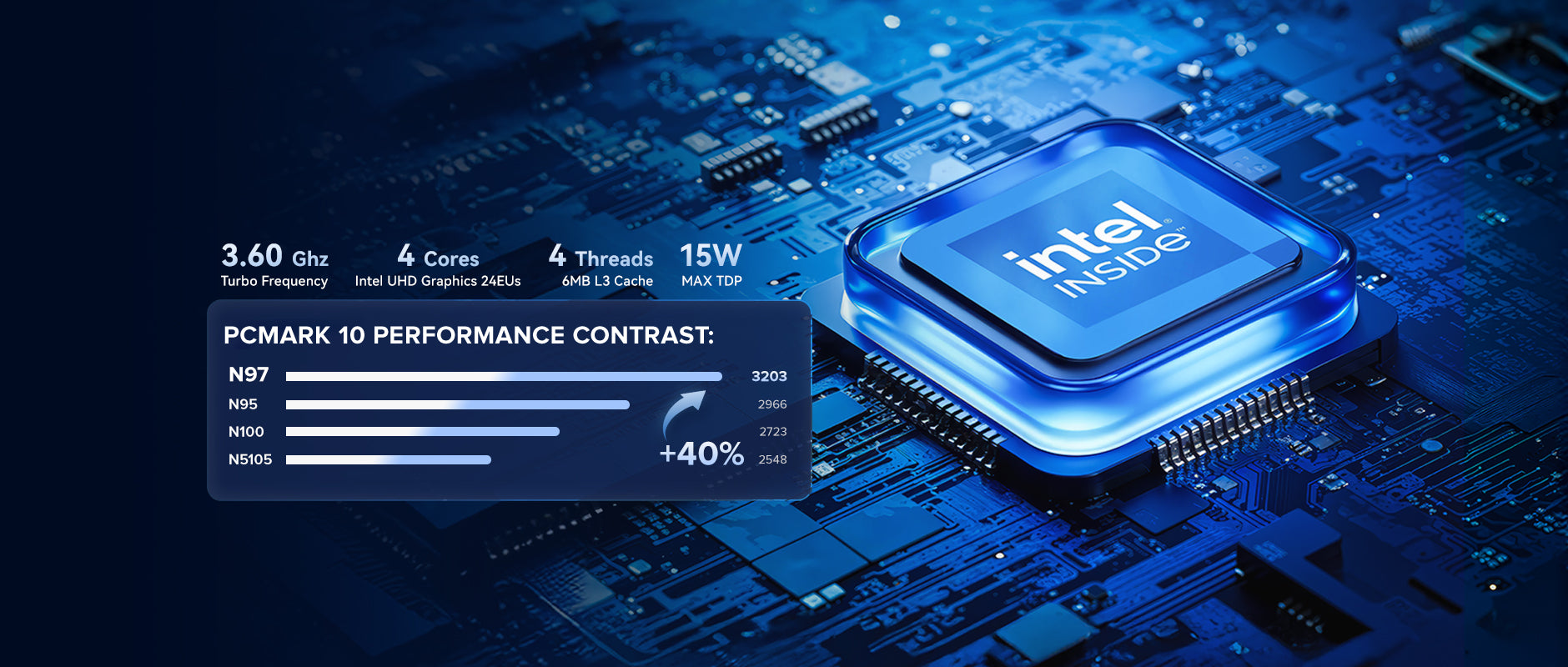 Processor | Intel® Processor Alder Lake-N N97 4 Cores/4 Threads, 6 MB Smart Cache, base frequency 2.0GHz, maximum acceleration clock frequency (Turbo) 3.6GHz |