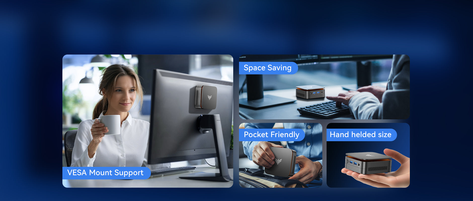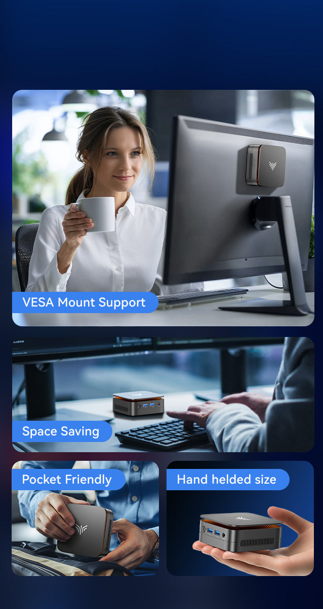 The KAMRUI Essenx E1 Mini PC features an ultra-compact design at just 3.96 × 3.96 × 1.57 inches. Powered by the Intel Processor N97 (4 cores, 4 threads, up to 3.6GHz, 6MB L3 cache), it offers up to 40% better responsiveness and smoother performance compared to Intel N95, N100, and N150 processors. With 16GB DDR4 RAM and a 256GB M.2 2280 SSD, it enables fast multitasking and seamless switching between applications—making it ideal for daily productivity, streaming, and light workloads.