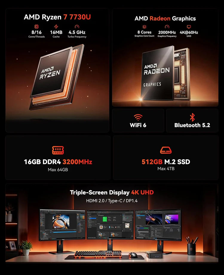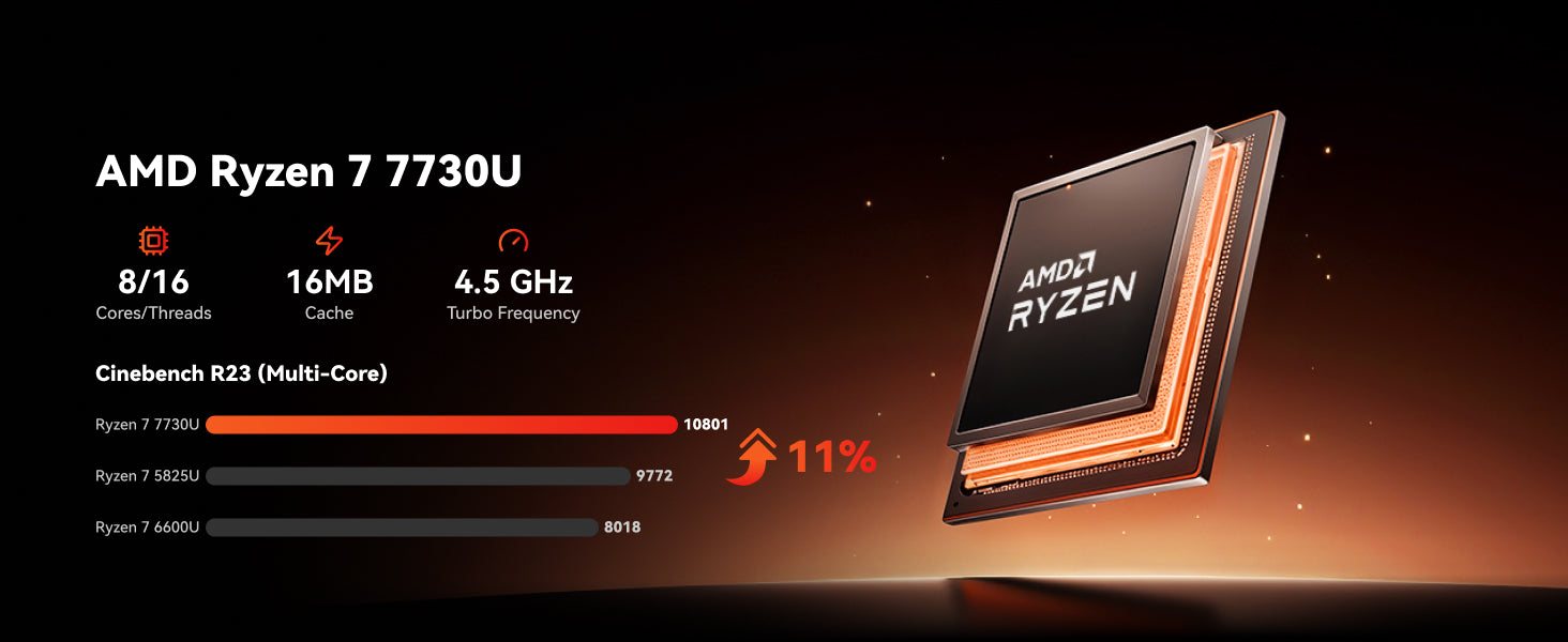 | Processor | AMD Ryzen™ 7 7730U Processor, 8 Cores/16 Threads (16MB Smart Cache, base frequency 2.0GHz, turbo frequency 4.5GHz) |