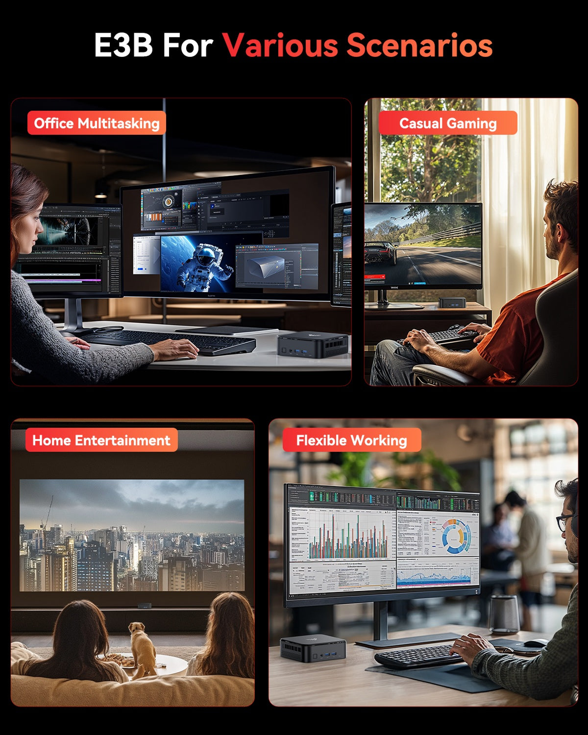 The NiPoGi E3B Mini PC is powered by AMD Ryzen™ 5 7430U processor, featuring 6 cores and 12 threads with a max boost clock of up to 4.3 GHz. It is equipped with integrated Radeon RX Vega graphics, offering excellent performance for graphics-intensive tasks. This compact computer is ideal for video and photo editing, office productivity, 4K video playback, casual gaming, and home theater use.