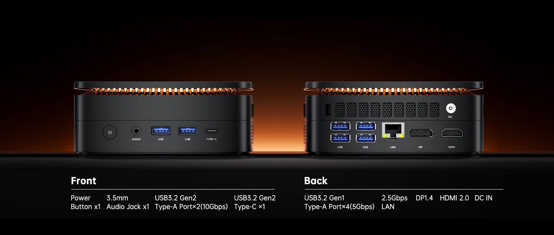 | Ports & Buttons | 10M/100M/1000Mbps/2.5Gbps adaptive RJ45 Gigabit Ethernet Port *1 USB3.2 Gen2 Type-A Port *2 (front port) USB3.2 Gen1 Type-A Port*4 (behind port) USB3.2 Gen2 Type-C *1 (Support DP1.4, 4K@60Hz, maximum 10Gbps data transfer) DC IN *1 HDMI 2.0 *1 DP1.4 *1 3.5mm Audio Jack *1 Power Button *1 |