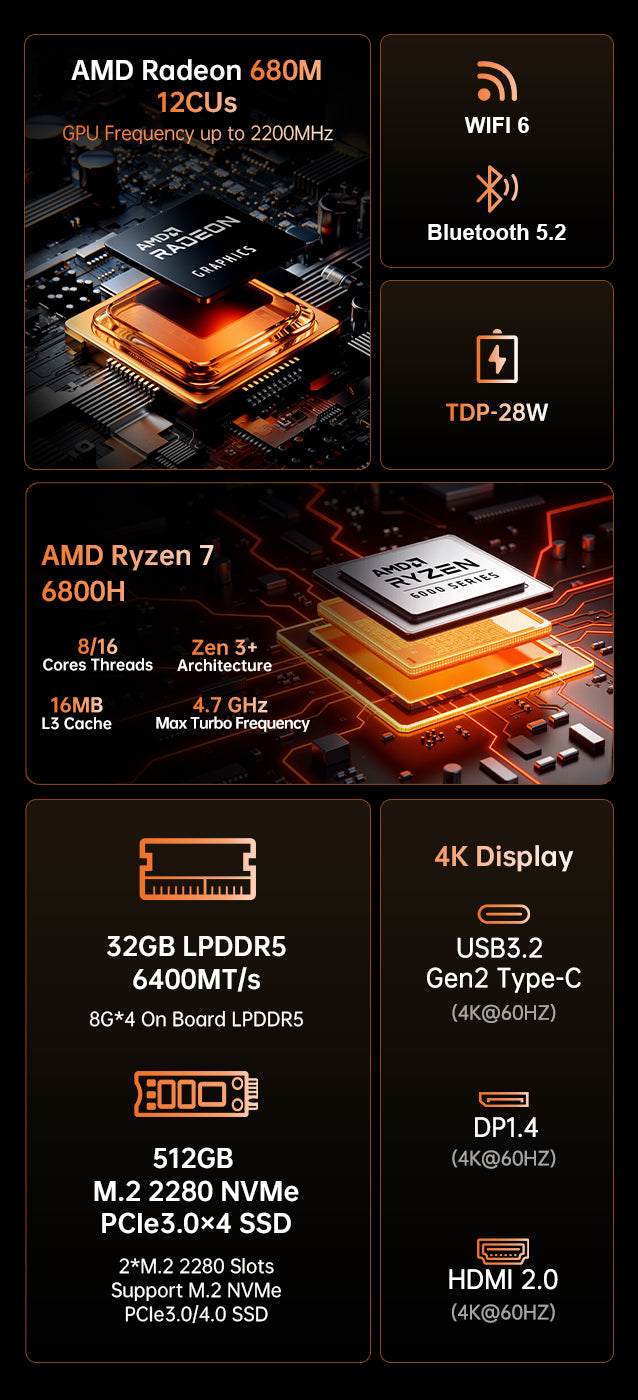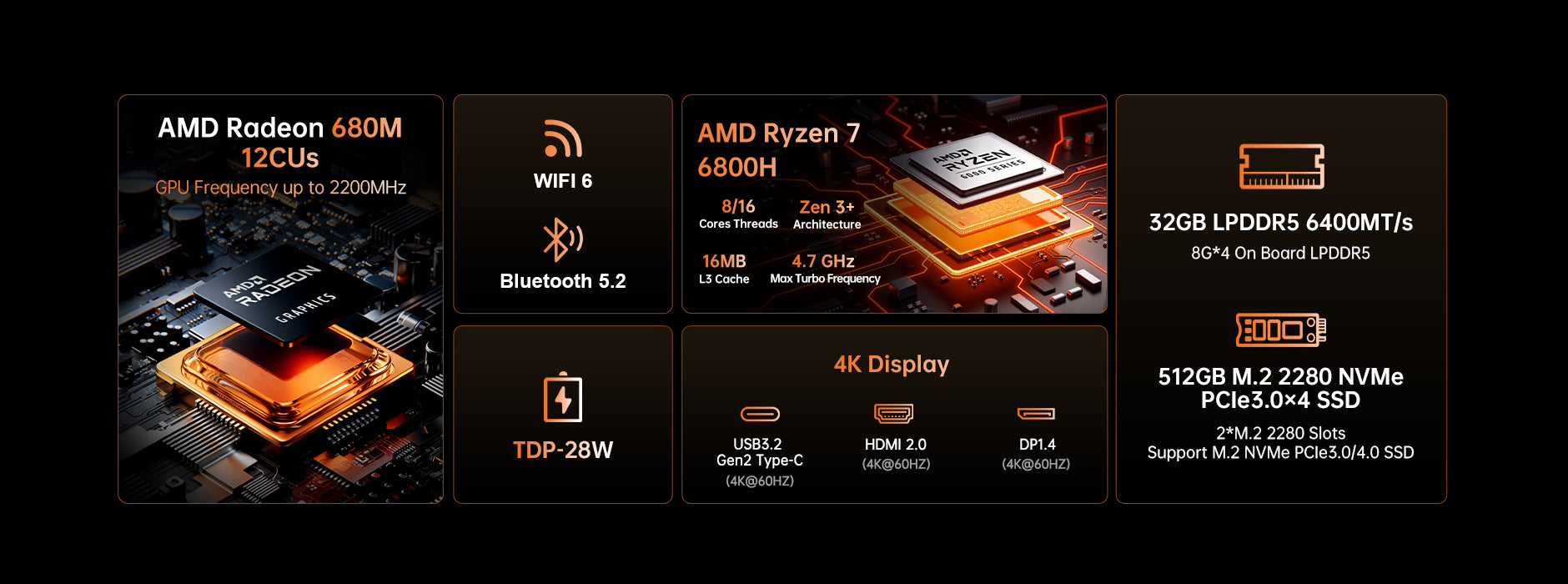 The KAMRUI H1 Mini PC is powered by the AMD Ryzen 7 6800H processor, featuring 8 cores and 16 threads with a max boost clock of up to 4.7GHz. It comes equipped with integrated Radeon 680M graphics, offering excellent performance for graphics-intensive tasks. This compact computer is ideal for video and photo editing, office productivity, 4K video playback, casual gaming, and home theater use.