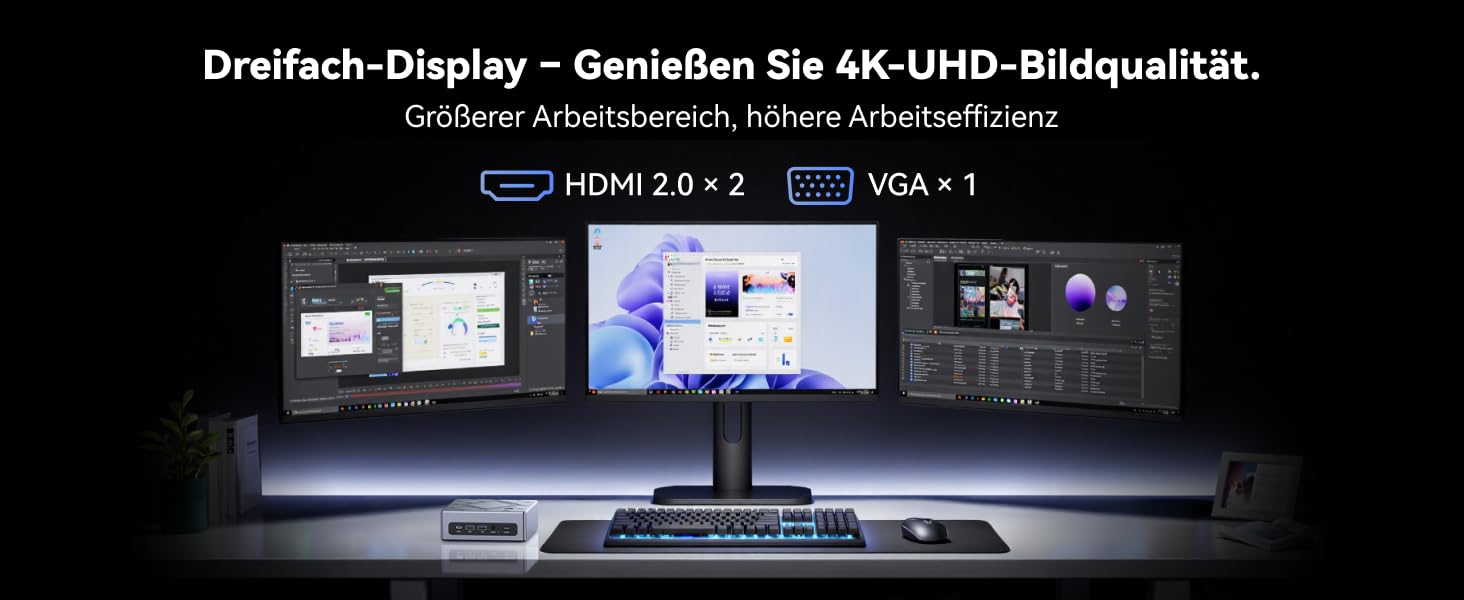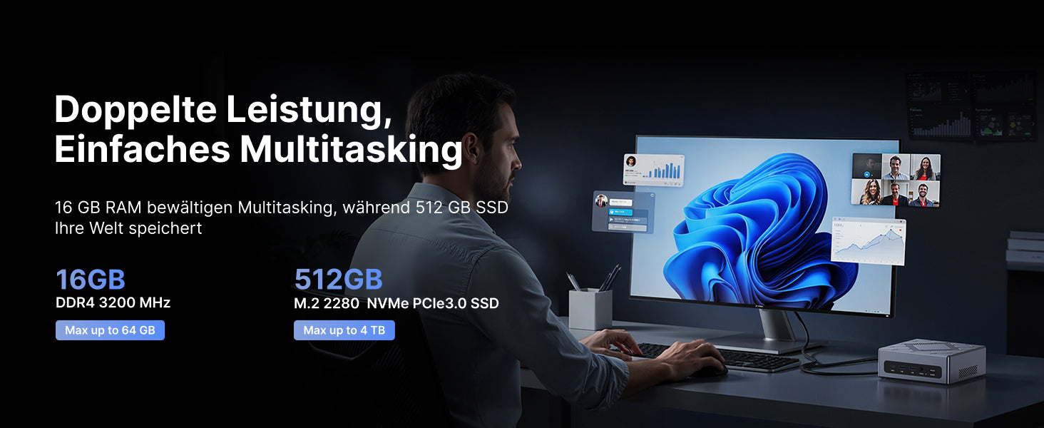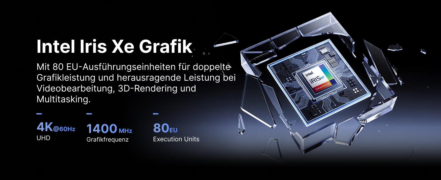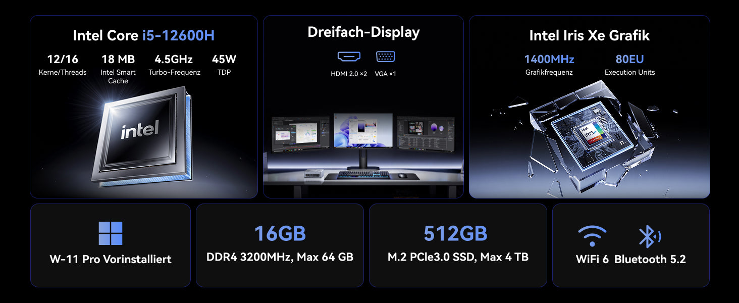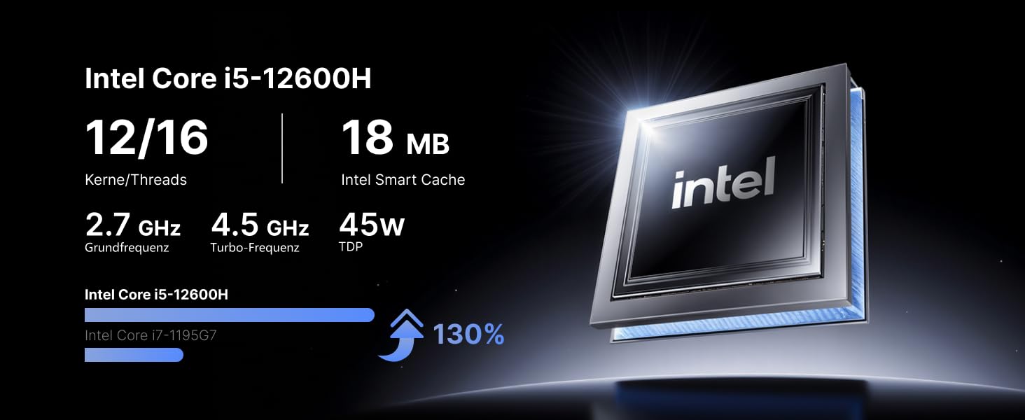 The KAMRUI CK10 Mini PC is powered by the Intel® Core™ i5-12600H processor, featuring 12 cores and 16 threads with a max boost clock of up to 4.5GHz. It comes equipped with integrated Intel Iris Xe Grafik, offering excellent performance for graphics-intensive tasks. This compact computer is ideal for video and photo editing, office productivity, 4K video playback, casual gaming, and home theater use.