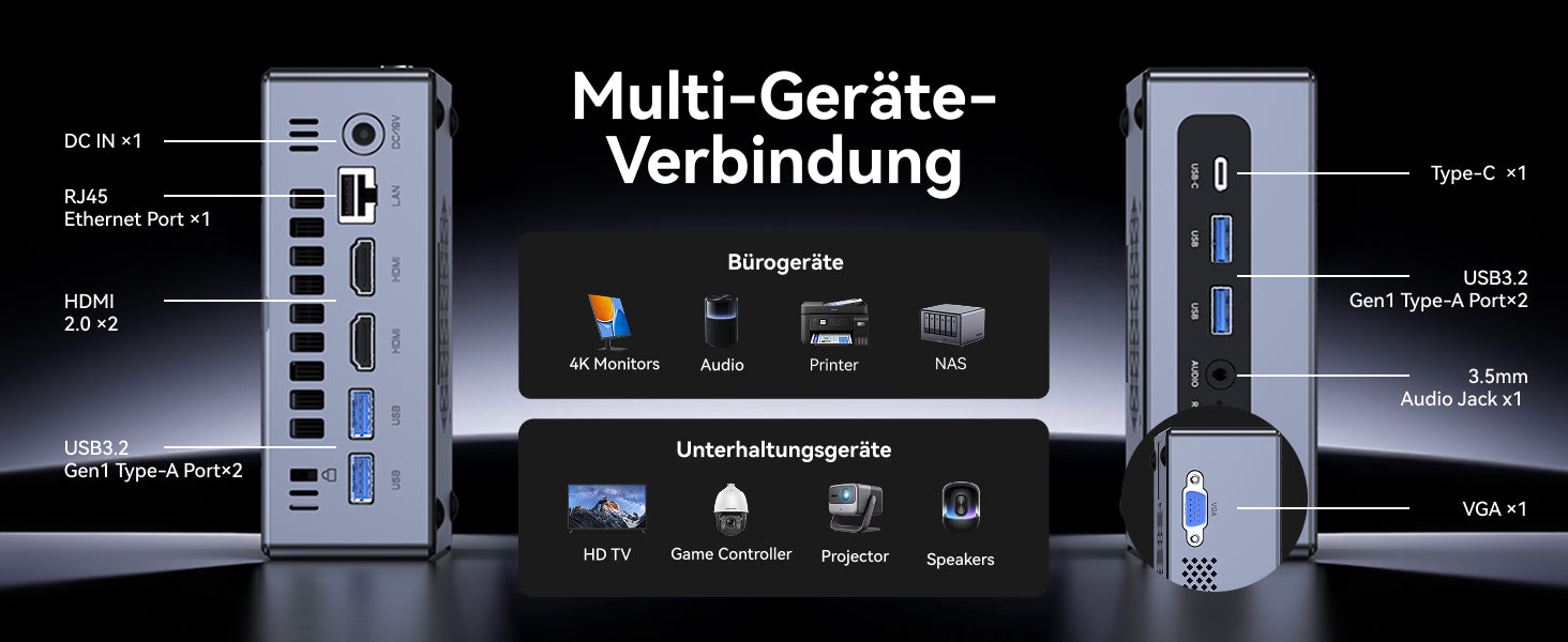| Ports & Buttons | 10M/100M/1000Mbps adaptive RJ45 Gigabit Ethernet Port *1 USB3.2 Gen1 Type-A Port *4 Type-C (supports data transfer and charging only) *1 HDMI 2.0 *2 VGA *1 3.5mm Audio Jack *1 |