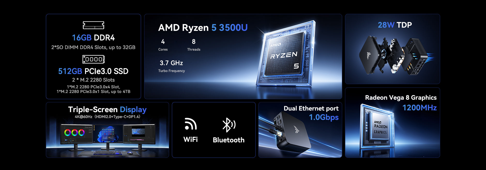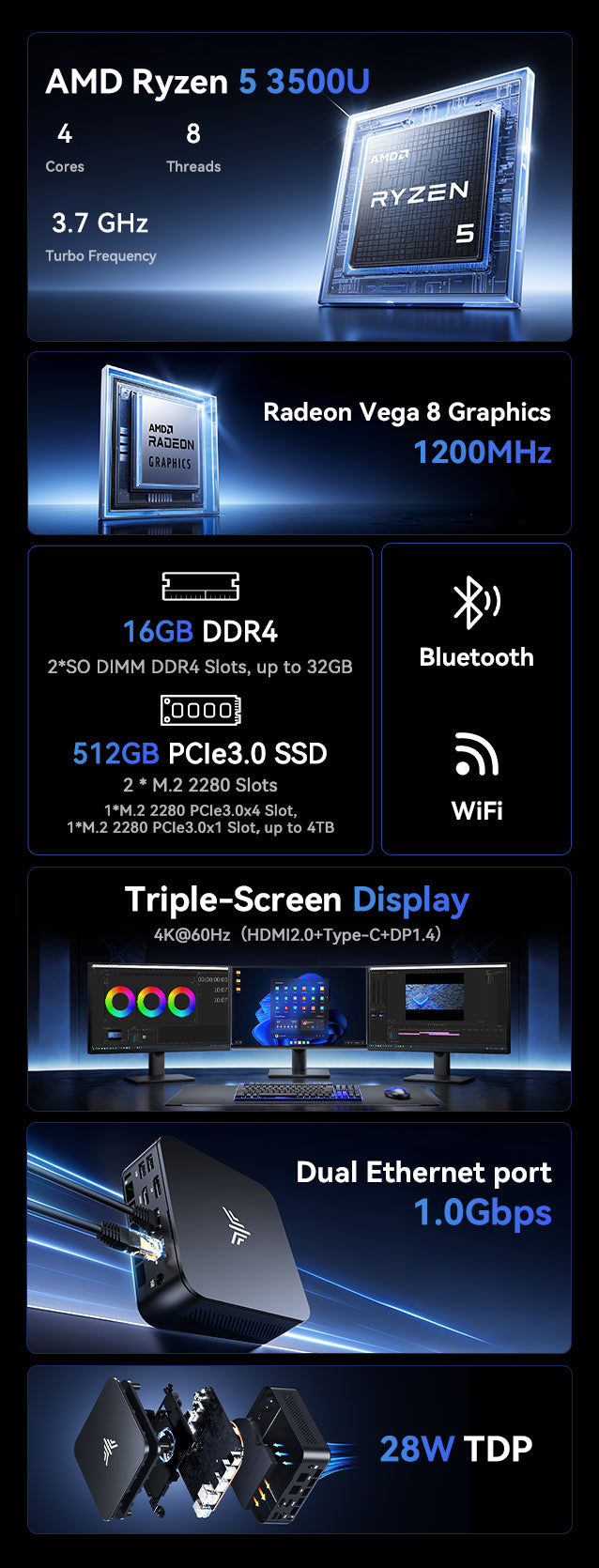 The KAMRUI E3 Mini PC is powered by AMD Ryzen™ 5 3500U processor, featuring 4 cores and 8 threads with a max boost clock of up to 3.7 GHz. It is equipped with integrated Radeon RX Vega 80graphics, offering excellent performance for graphics-intensive tasks. This compact computer is ideal for video and photo editing, office productivity, 4K video playback, casual gaming, and home theater use.