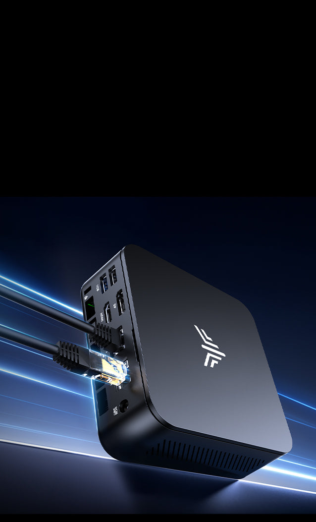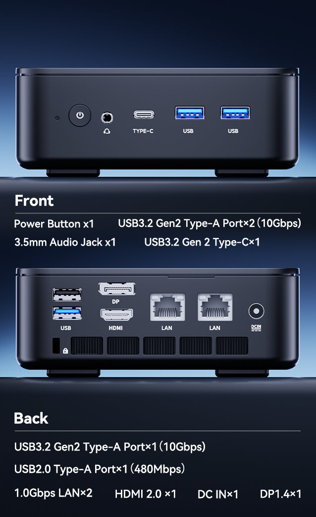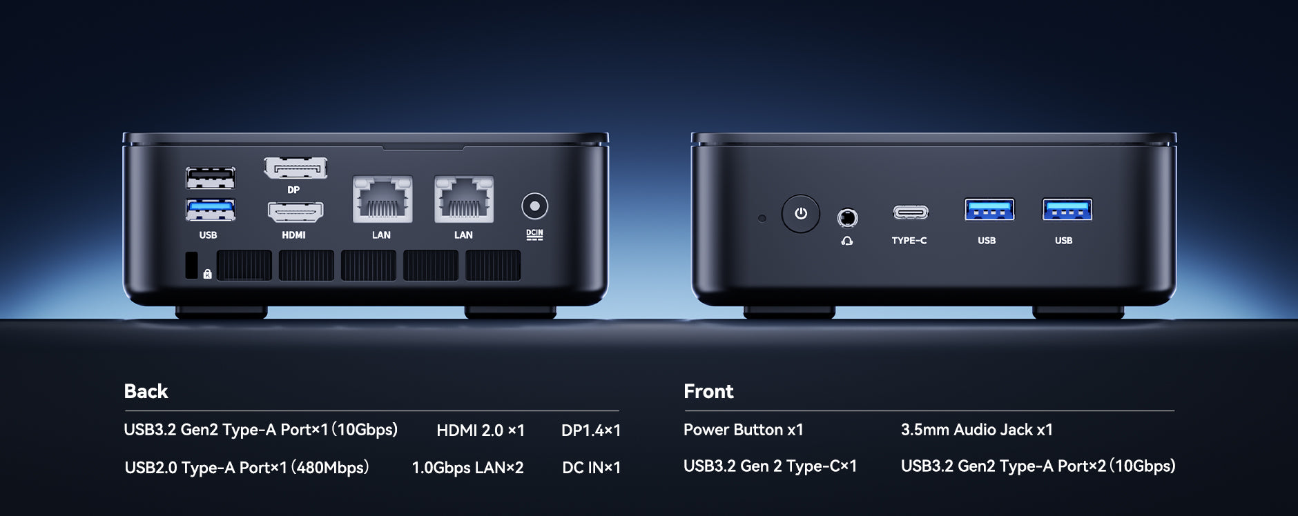 | Ports & Buttons | 10M/100M/1000Mbps LAN Port *2 USB3.2 Gen2 Type-A Port *3 USB2.0 Type-A Port*1 USB3.2 Gen2 Type-C *1 (Support DP1.4, 4K@60Hz, maximum 10Gbps data transfer, PD output) DC IN *1 HDMI 2.0 *1 DP1.4b *1 3.5mm Audio Jack *1 Power Button *1 |