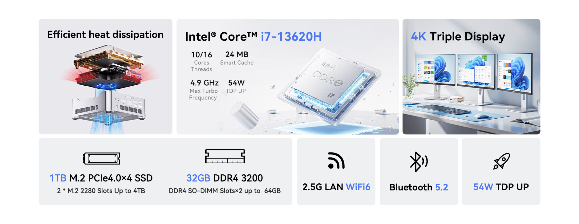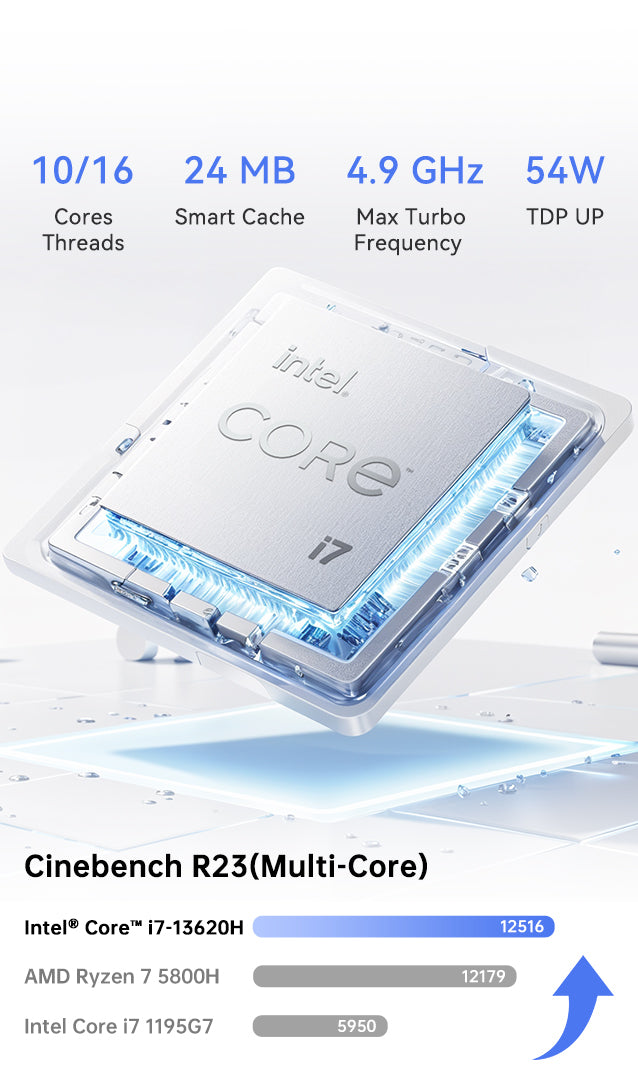 The KAMRUI H2 Mini PC is powered by the Intel® Core™ i7-13620H processor, featuring 10 cores and 16 threads with a max boost clock of up to 4.3GHz. It comes equipped with integrated Intel® UHD Graphics, offering excellent performance for graphics-intensive tasks. This compact computer is ideal for video and photo editing, office productivity, 4K video playback, casual gaming, and home theater use.
