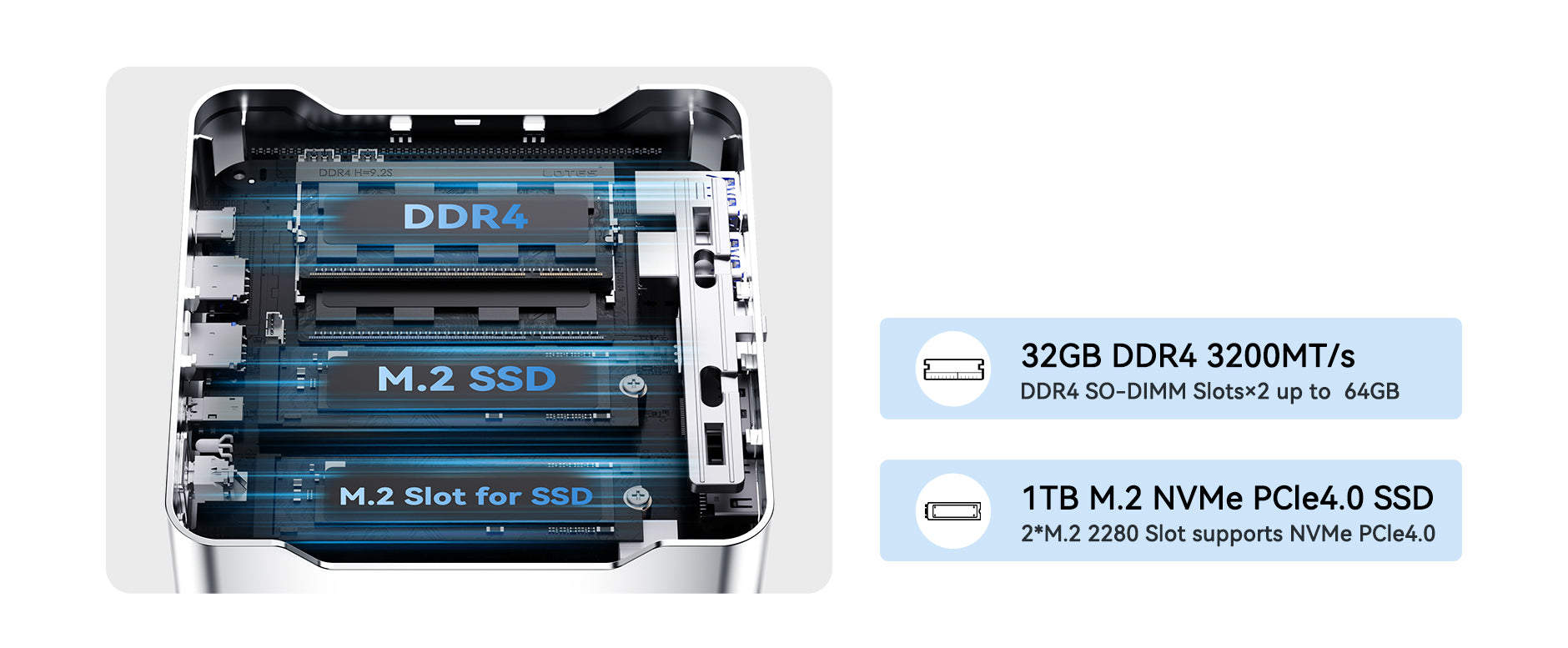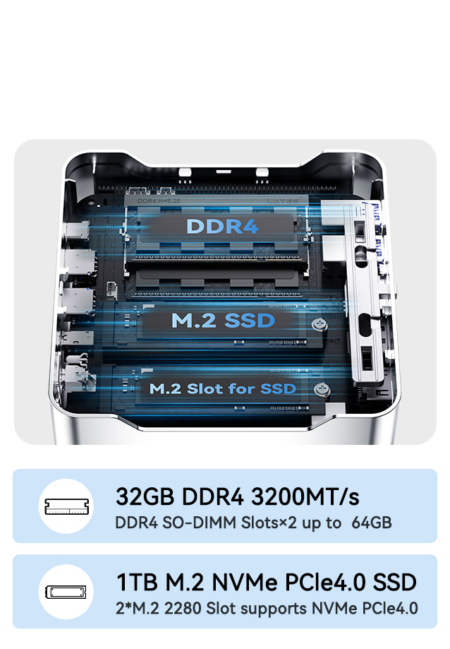 | Memory | 32GB (16GB*2)DDR4 3200MHz (DDR4 SO-DIMM Slot*2, up to 64GB) |