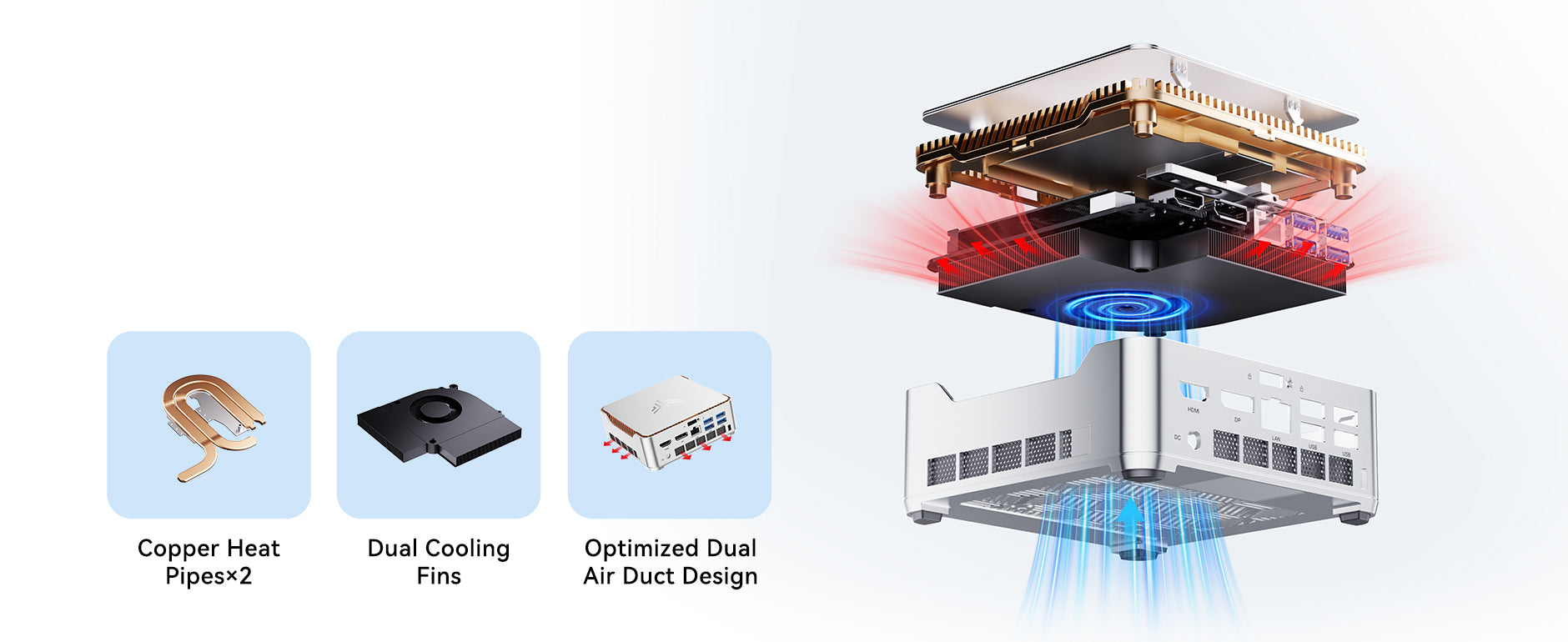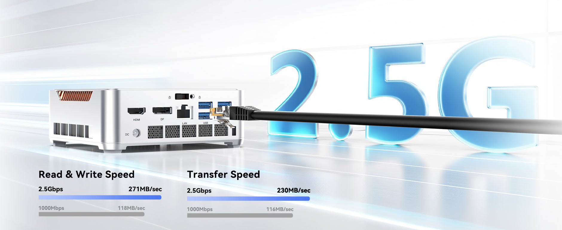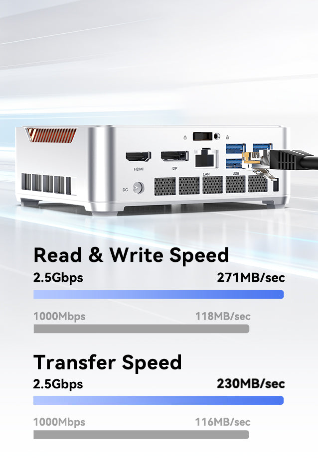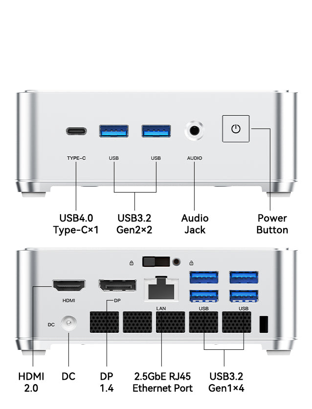 | Ports & Buttons | 2.5Gbps (10M/100M/1000Mbps adaptive) LAN Port *1 USB3.2 Gen2 Type-A Port *2 (front port) USB3.2 Gen1 Type-A Port*4 (behind port) USB4 Type-C *1 (Support DP1.4, 4K@120Hz, maximum 40Gbps data transfer, PD 15W output) DC IN *1 HDMI 2.0 *1 DP1.4 *1 3.5mm Audio Jack *1 Power Button *1 |