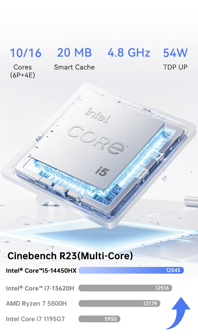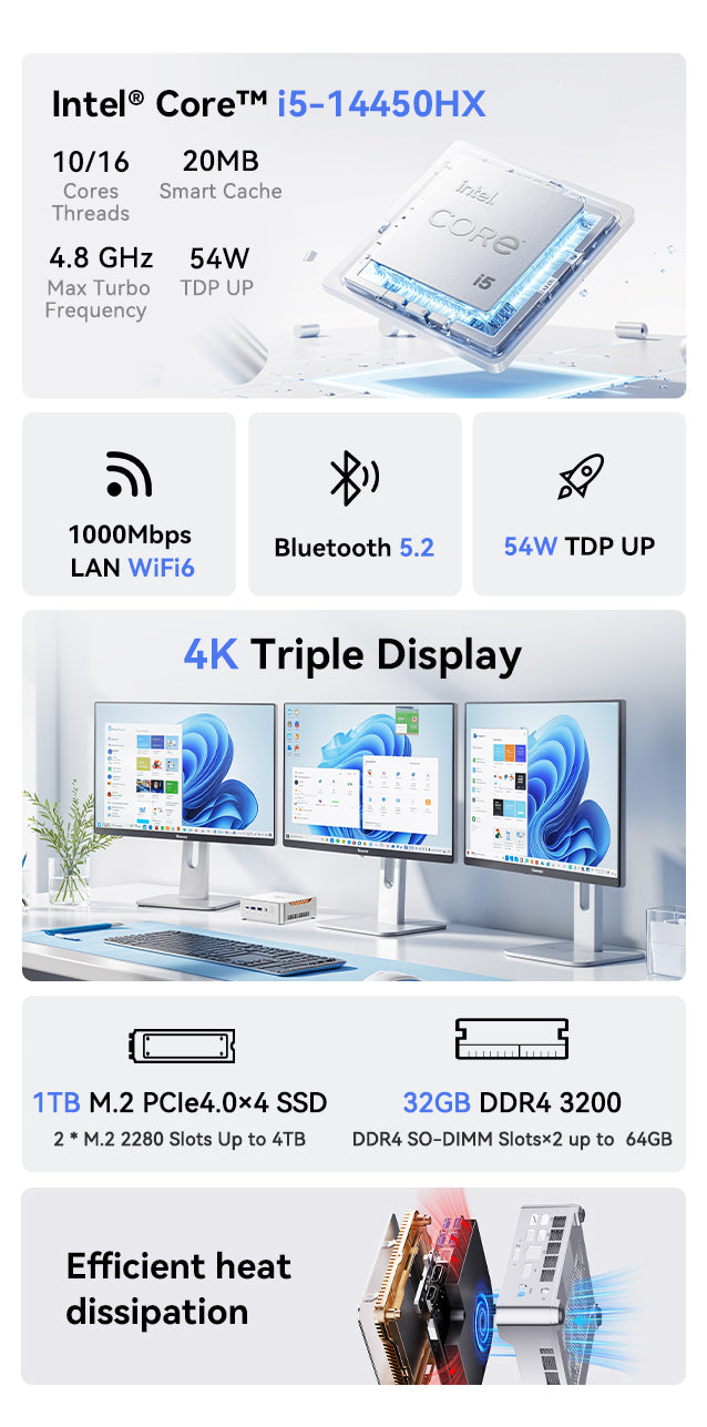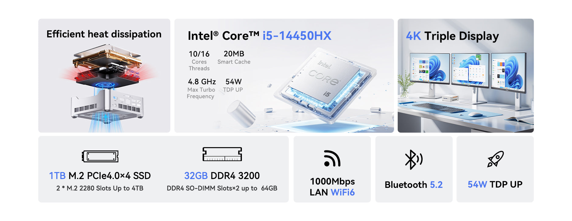 The KAMRUI H2 Mini PC is powered by the Intel® Core™ i5-14450HX processor, featuring 10 cores and 16 threads with a max boost clock of up to 4.8GHz. It comes equipped with integrated Intel® UHD Graphics for 14th Gen Intel® Processors, offering excellent performance for graphics-intensive tasks. This compact computer is ideal for video and photo editing, office productivity, 4K video playback, casual gaming, and home theater use.