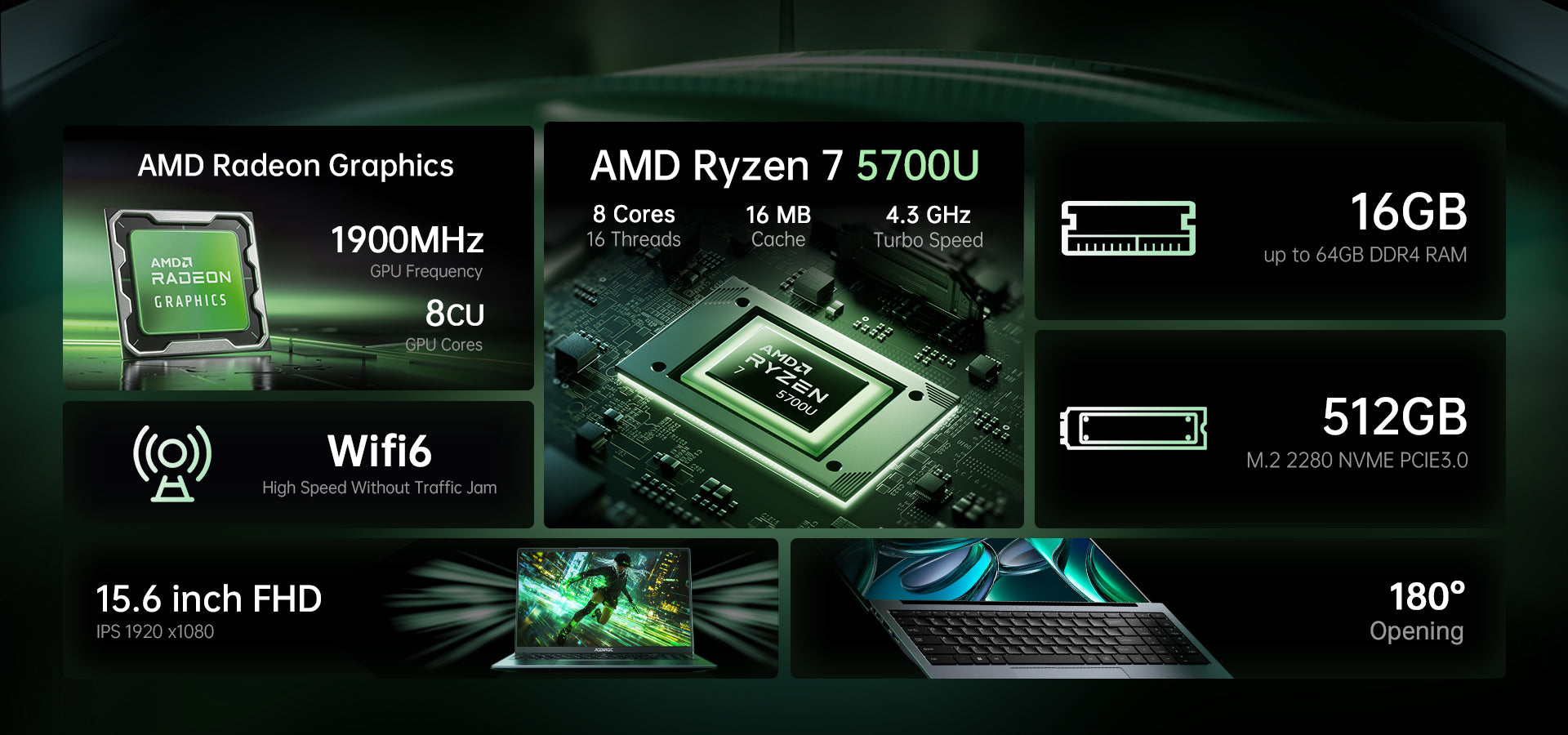 | Processor | AMD Ryzen™ 7 7730U Processor, 8 Cores/16 Threads, 16 MB Smart Cache, base frequency 2.0GHz, maximum acceleration clock frequency (Turbo) 4.5GHz |