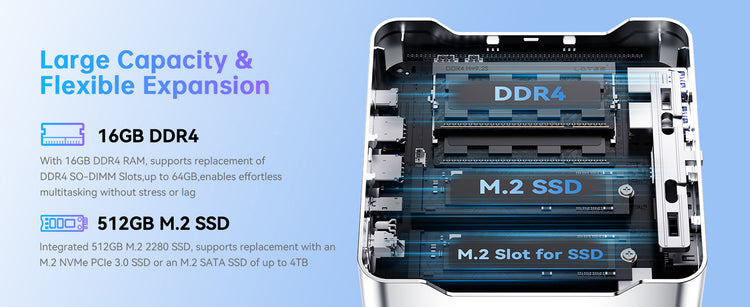 The KAMRUI P2 Mini PC is powered by AMD Ryzen™ 4300U processor, featuring 4 cores and 4 threads with a max boost clock of up to 3.7 GHz. It is equipped with integrated AMD Radeon™ Graphics, offering excellent performance for graphics-intensive tasks. This compact computer is ideal for video and photo editing, office productivity, 4K video playback, casual gaming, and home theater use.
