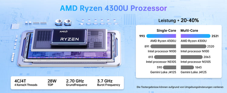 | Processor | AMD Ryzen™ 4300U Processor, 4 Cores/4 Threads, 4 MB Smart Cache, base frequency 2.7GHz, maximum acceleration clock frequency (Turbo) 3.7GHz |