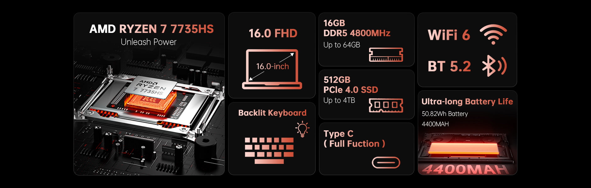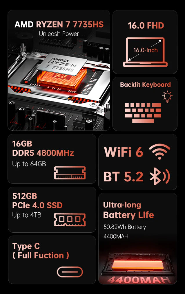| Processor | AMD Ryzen™ 7 7735HS Processor, 8 Cores/16 Threads, 16 MB Smart Cache, base frequency 3.2GHz, maximum acceleration clock frequency (Turbo) 4.75GHz |